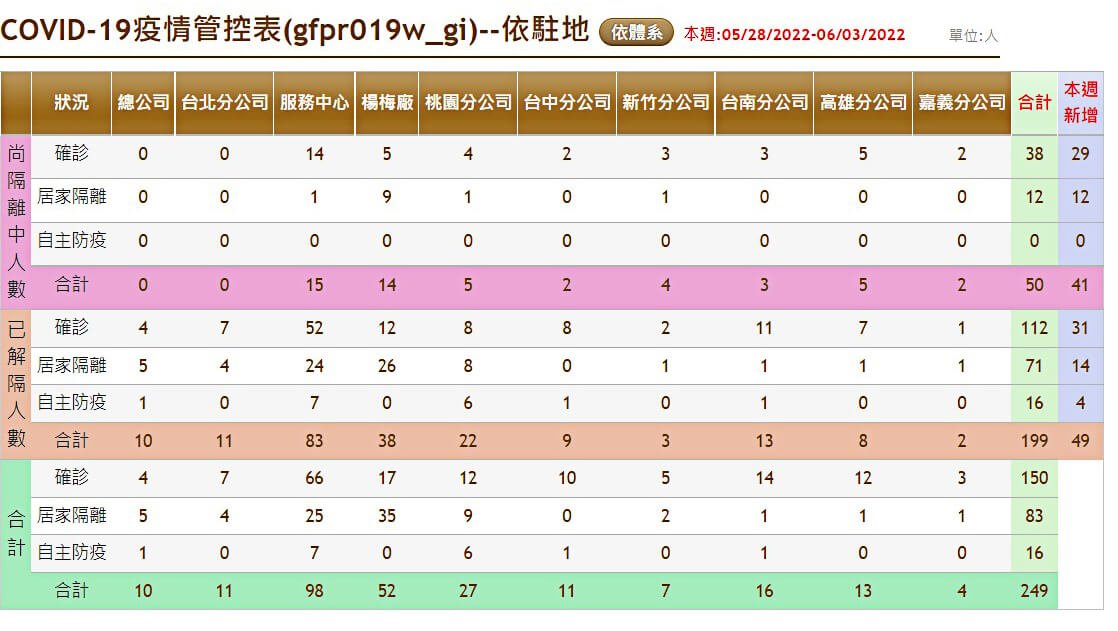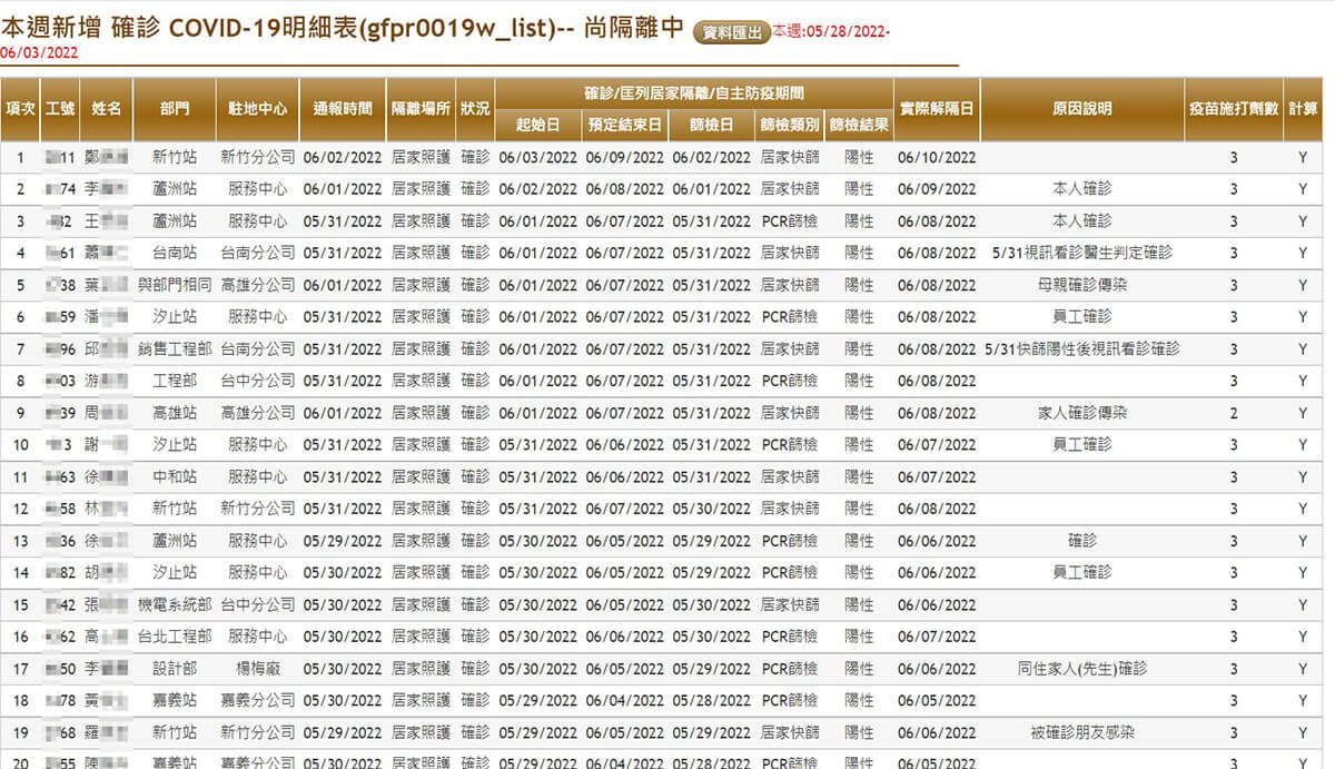 四月初Omicron疫情飆升之際,崇友立即推出各單位人員自主管控表,並匯集於總表~全公司確診、隔離或出勤人員數一目瞭然,除了便於各級主管以電話或送物資關懷外,亦可利於主管判斷是否實施異地上班措施。