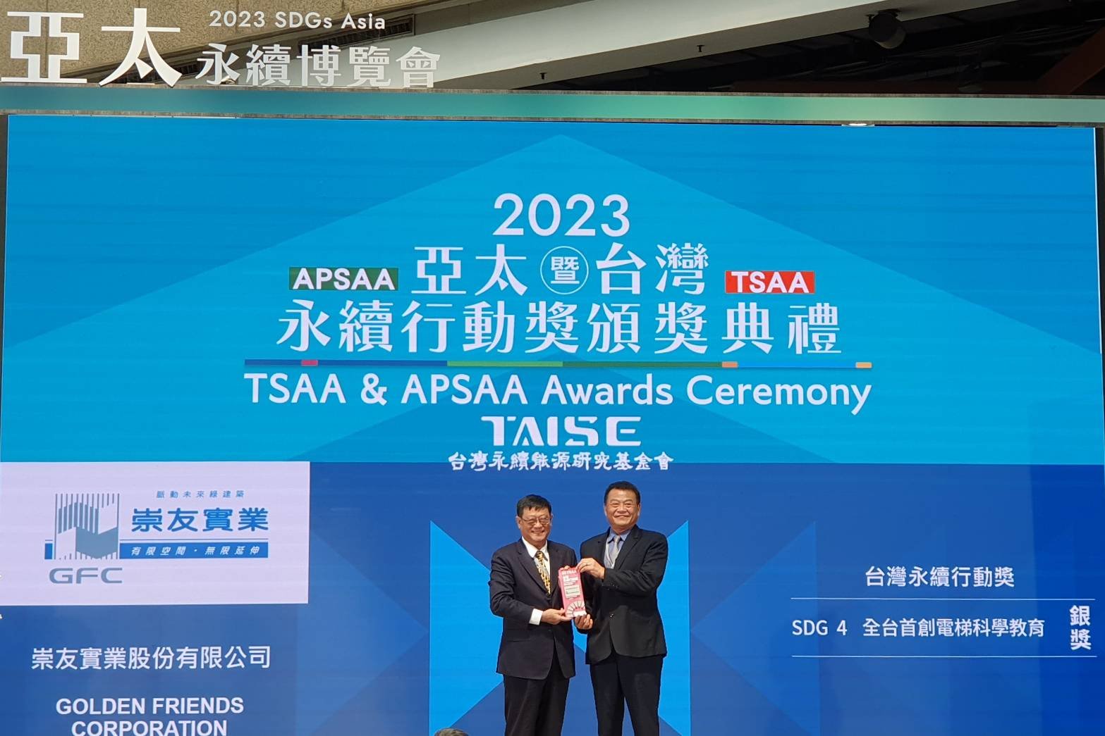 崇友實業自2007年發起「電梯科學安全教育」專案,結合企業與基金會多項資源與經驗,以強調電梯的安全、倡導電梯的節能減碳,並導入認識電梯科學原理的教育概念。透過簡單易懂的教案及教具設計,讓社區民眾及學生輕鬆了解電梯,提高對升降機公共安全的重視。此專案符合聯合國「優質教育 (SDG 4)」、「城市和社區的可持續發展 (SDG 11)」及「可持續消費和生產 (SDG 12)」等永續發展目標;今年崇友實業參與由台灣永續能源研究基金會(TAISE)舉辦之「2023年第3屆台灣永續行動獎」評選,喜獲SDG04銀級獎之殊榮。
