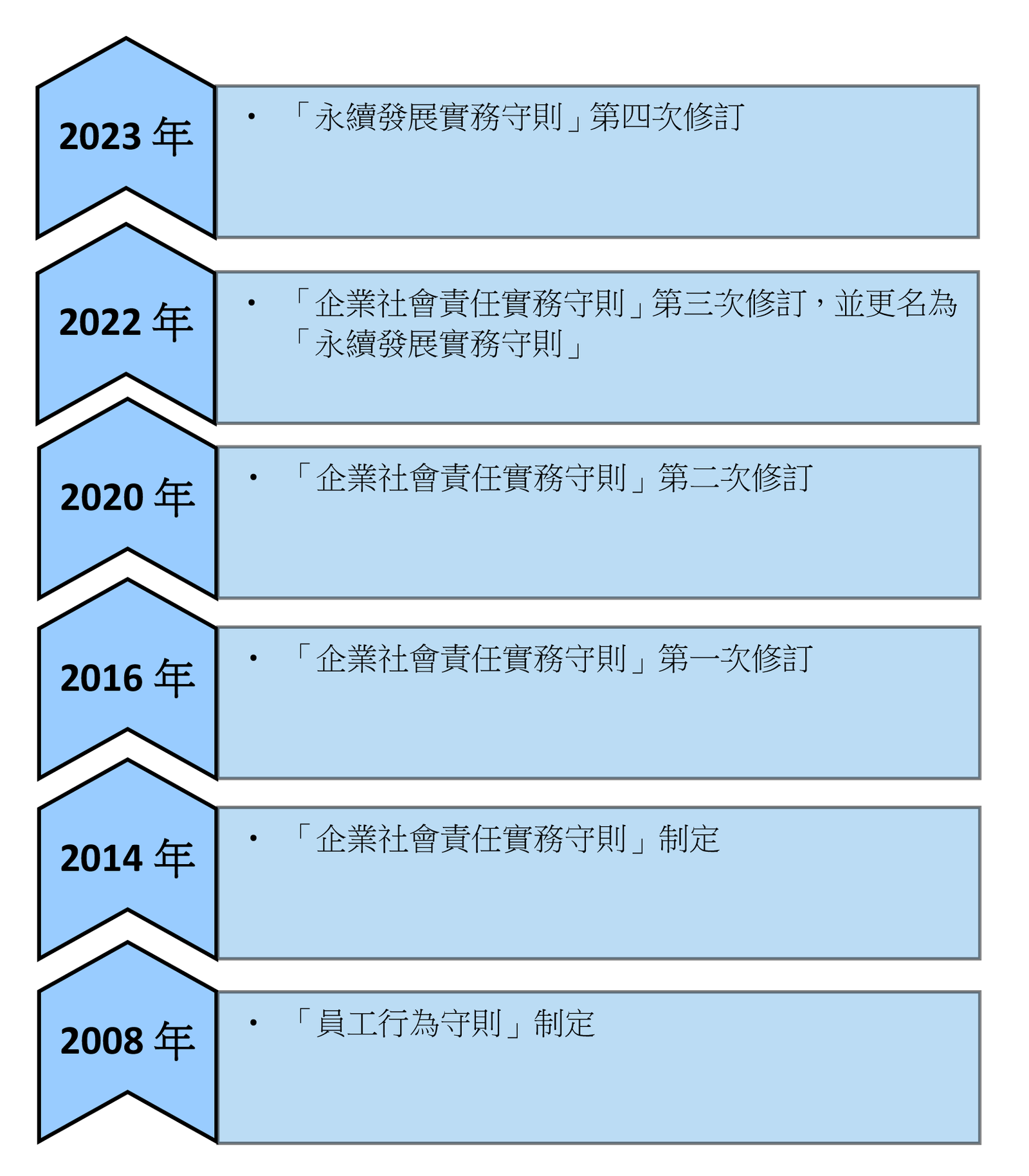 本公司董事會於2014年12月19日決議通過制訂「企業社會責任實務守則」,並於2022年03月25日董事會決議通過更名為「永續發展實務守則」,揭示從事企業經營之同時,積極實踐企業永續發展,並透過企業公民擔當,改善員工、社區、社會之生活品質;同時,以落實公司治理、發展永續環境、履行社會公益、加強企業永續發展資訊揭露等原則持續實踐企業永續發展。