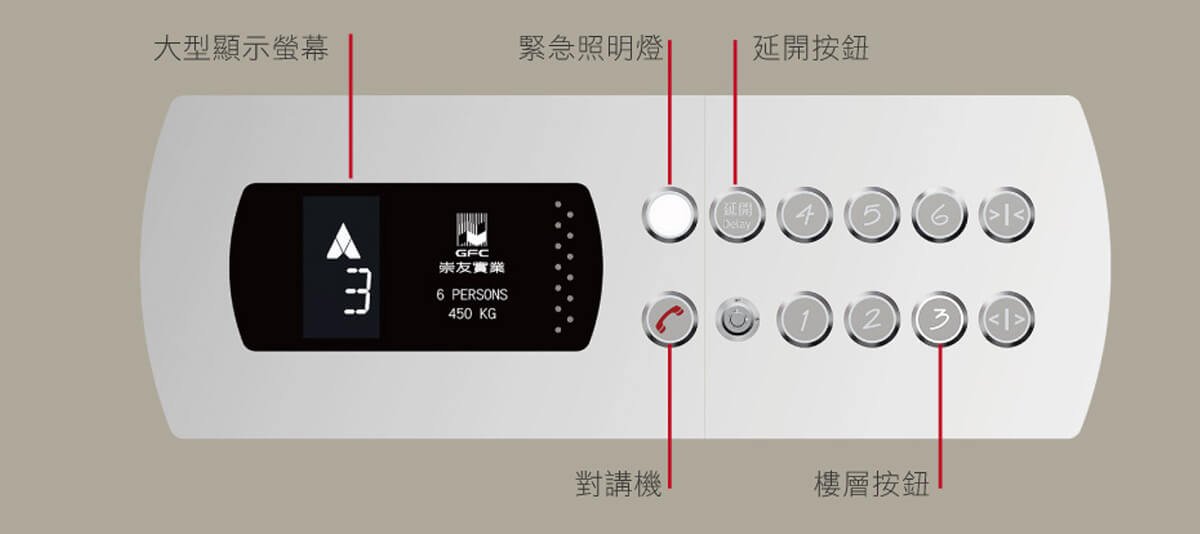匠心獨具的車廂操作盤,除了有明亮的樓層指示及選擇按鈕外;尚有內建雙向通話對講機及緊急照明,橫向、腰間高度的設計更能體貼家中的長者或小孩。