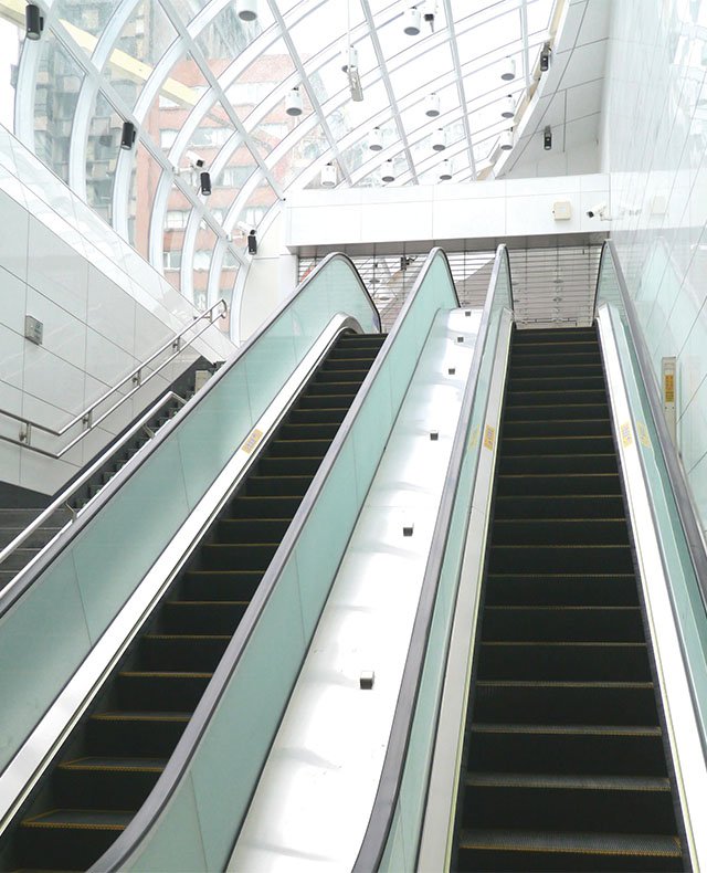 崇友實業為台北捷運松山線小巨蛋站、南京復興站提供9台電梯,52台電扶梯,總數共61台;圖為扶梯外觀。