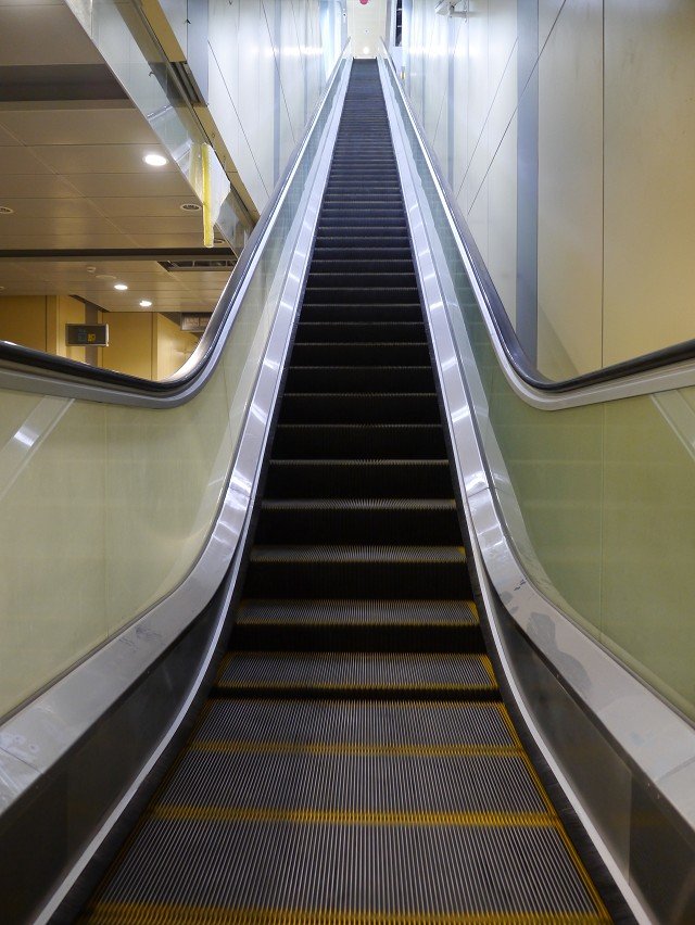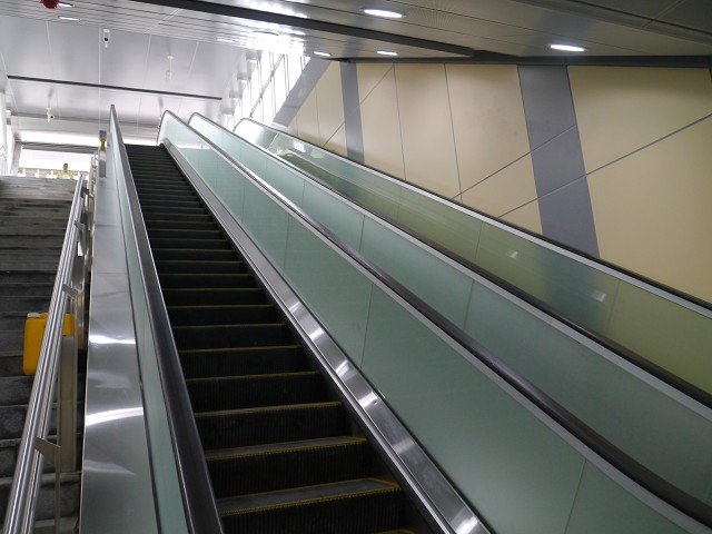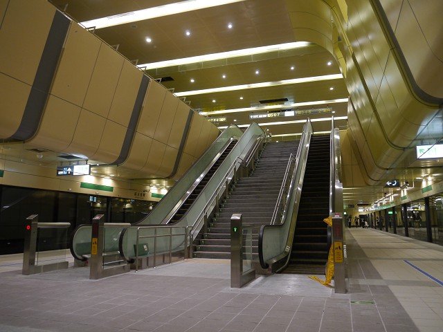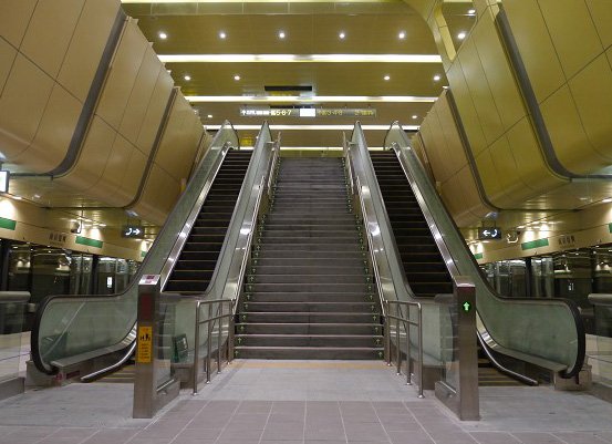 崇友實業為台北捷運松山線小巨蛋站、南京復興站提供9台電梯,52台電扶梯,總數共61台;圖為連結月台層之扶梯。