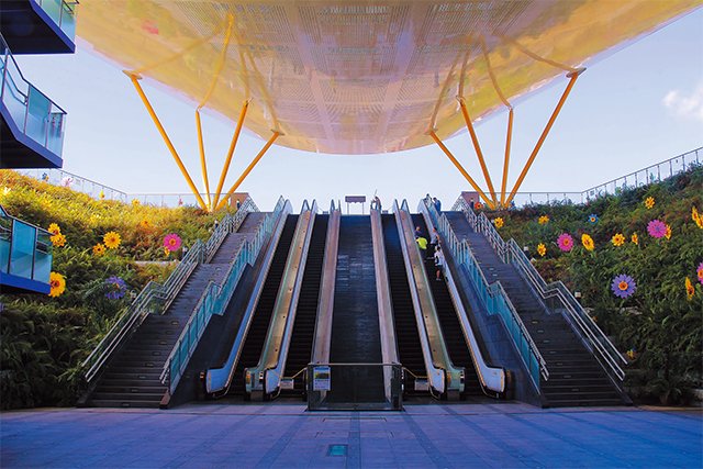 崇友實業為高雄捷運紅線和橘線37個車站,提供了315台電扶梯,最長電扶梯揚程為13.96公尺(生態園區站);圖為中央公園站扶梯入口處。