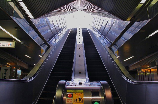 崇友實業為高雄捷運紅線和橘線37個車站,提供了315台電扶梯,最長電扶梯揚程為13.96公尺(生態園區站);圖為美麗島站扶梯。