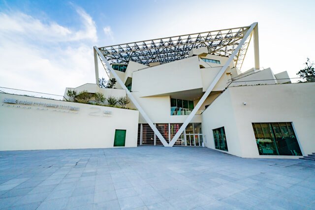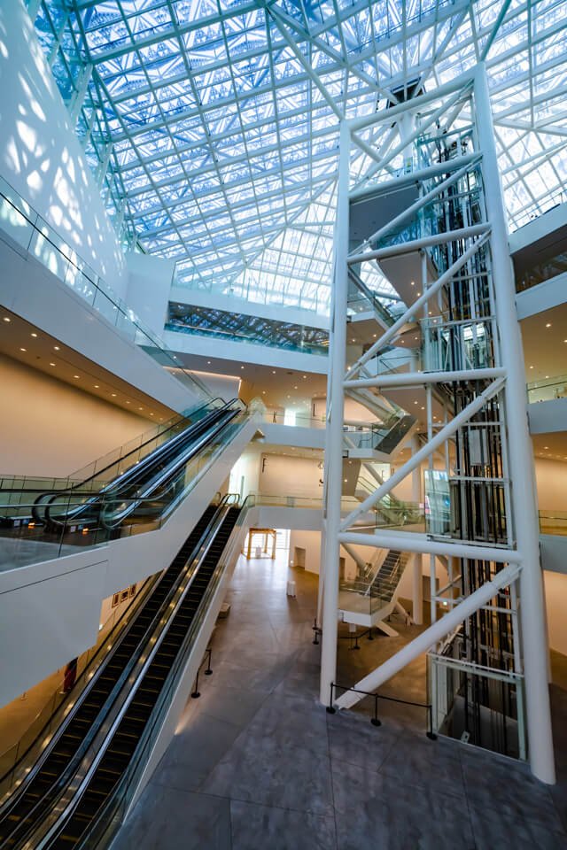 二館建築為日本建築師坂茂所設計,主體建築以具臺南特色鳳凰花轉化為五角造型,崇友實業為臺南市美術館二館提供10台電梯,4台電扶梯。