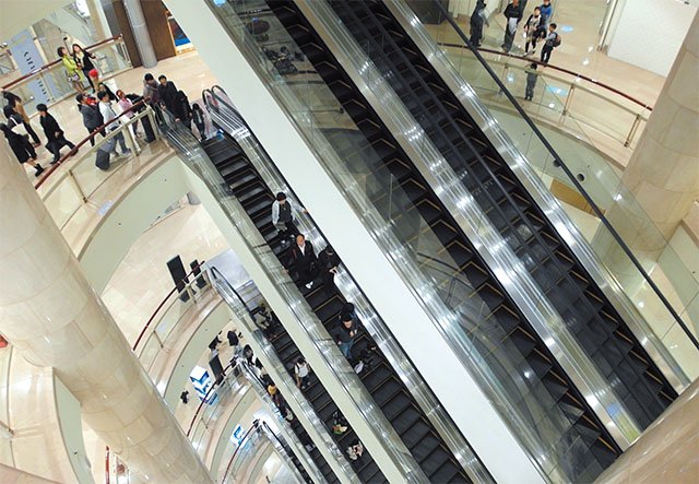 購物廣場中使用了42台扶梯,分布在L型建物的三個角點,方便購物者瀏覽各個不同樓層的櫥窗。