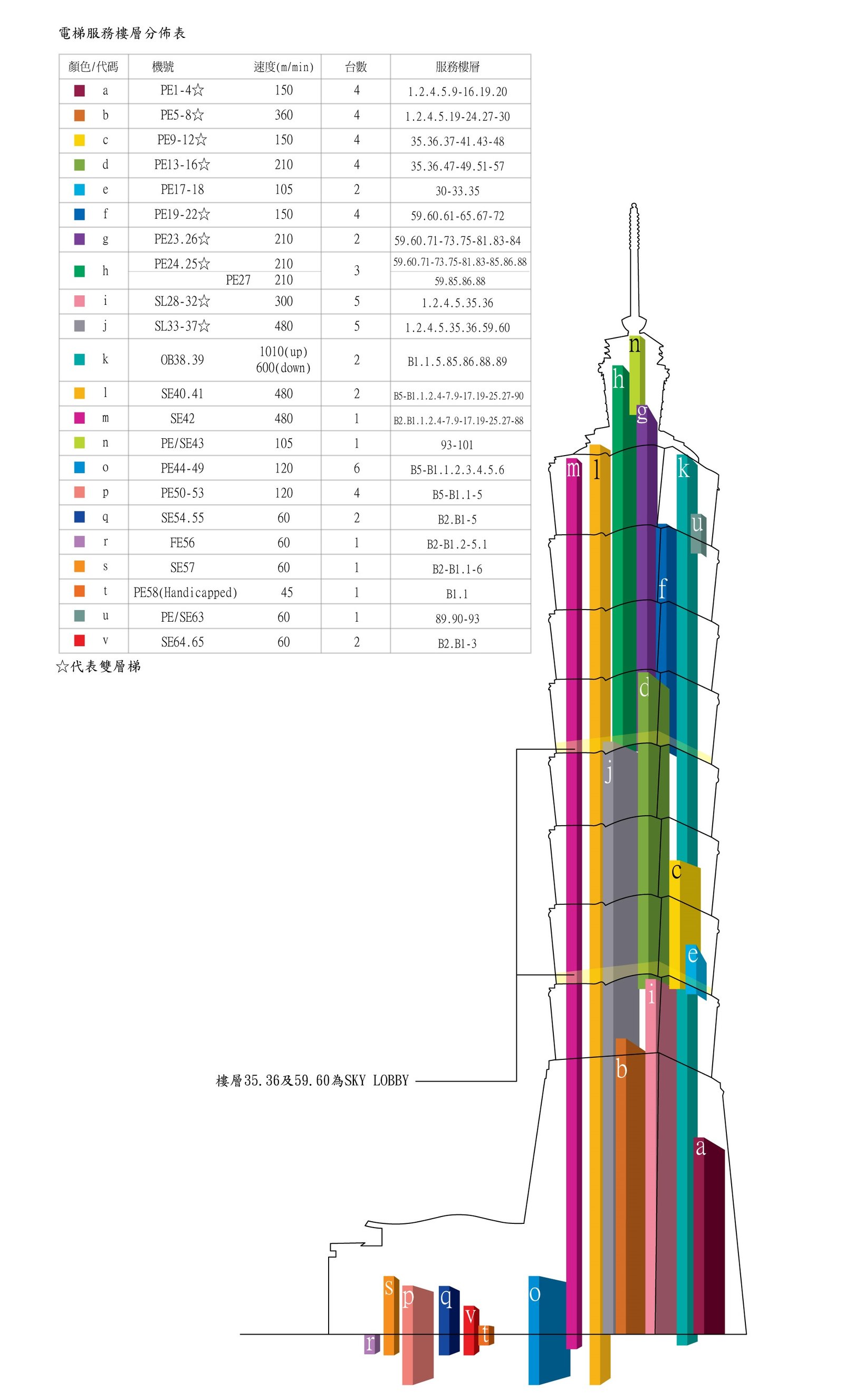 清楚標示出台北101大樓所有電梯的號機、速度與分布位置,35、36與59、60樓是作為轉乘層的Sky lobby。