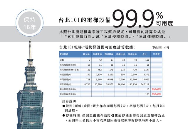 日本東芝電梯和台灣崇友實業,合力打造、並維護了這條交通大動脈。18年來,它已為台北101載運了1.2億人次出出入入的乘客;也連續18年、每年以99.9%的可用度持續運轉中。