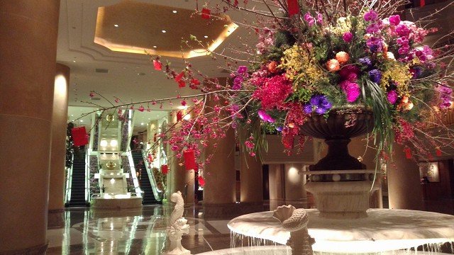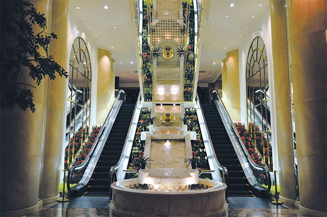 崇友實業為君悅大飯店提供19台電梯,8台扶梯;圖為大廳及扶梯。