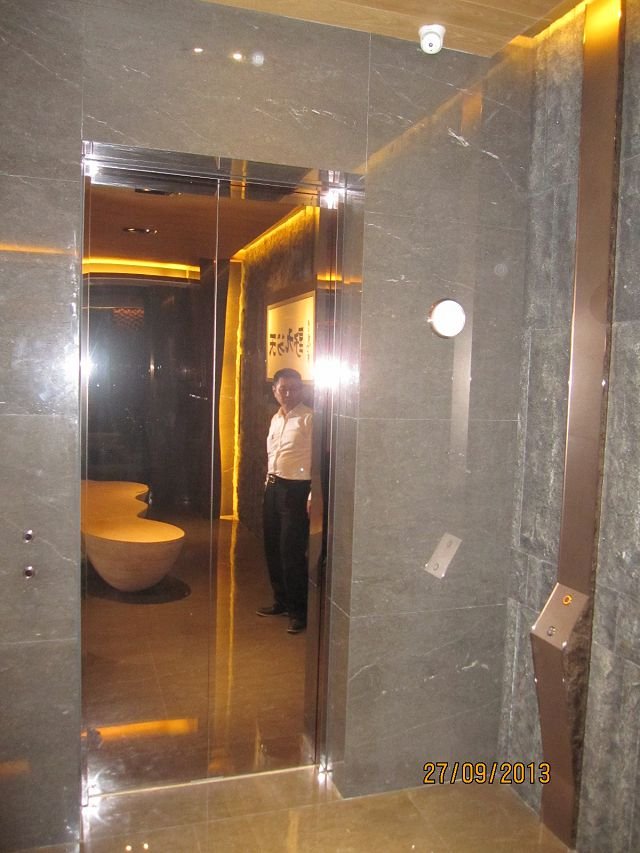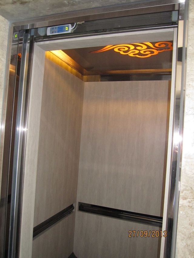 崇友實業為九野大樓提供安全舒適的電梯運輸方案;圖為及電梯車廂內部及天井。
