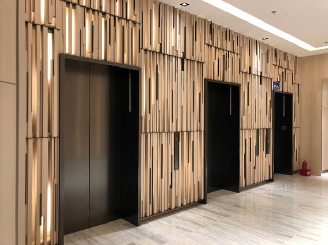 崇友實業為本案提供15台電梯;圖為酒店區乘場。