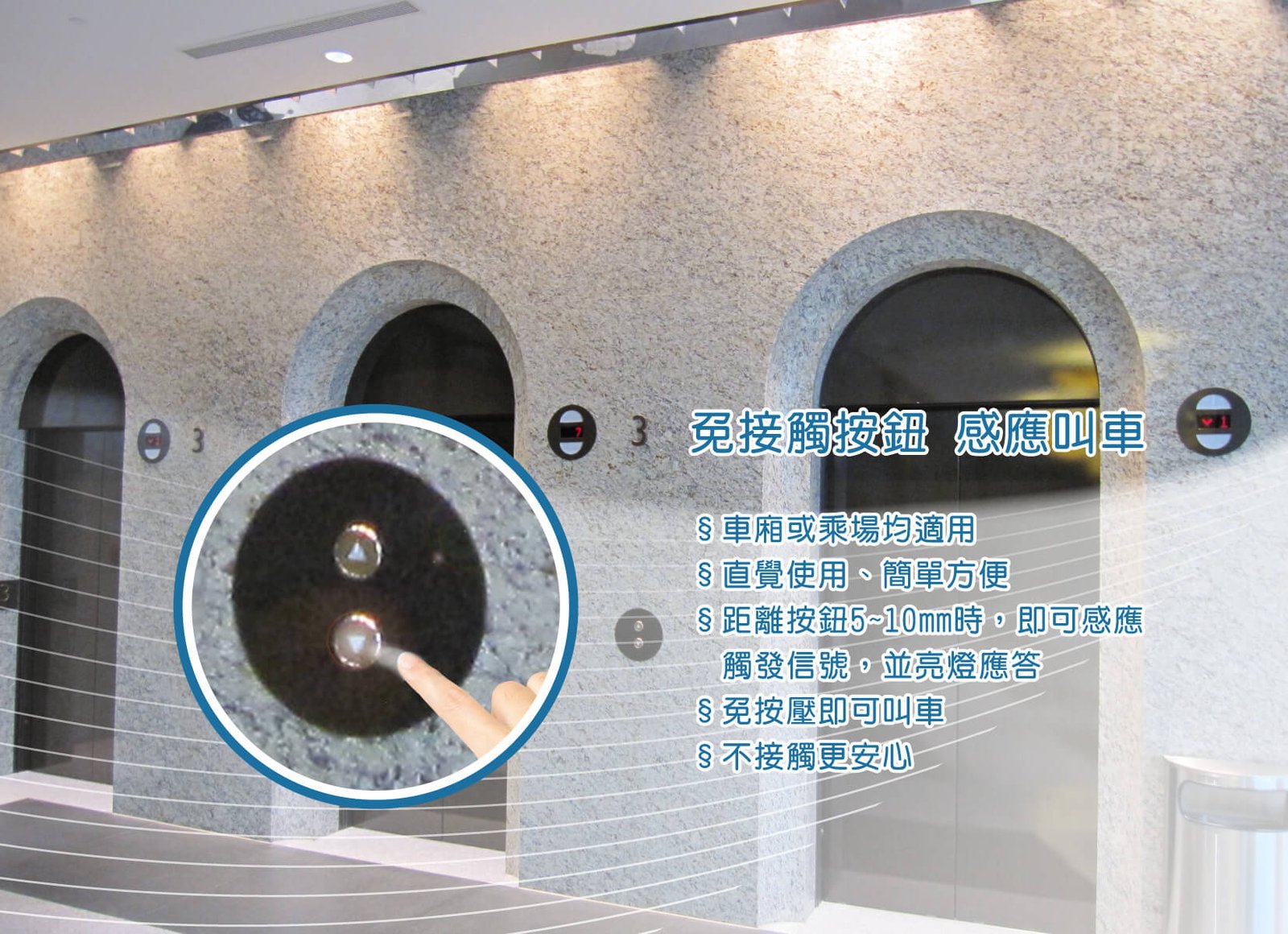 手勢叫車感應器,採用按鈕式外觀與乘場面板融為一體,搭配直覺人因手勢,25cm範圍內揮動快速感應,免按壓即可叫車,不接觸更安心!