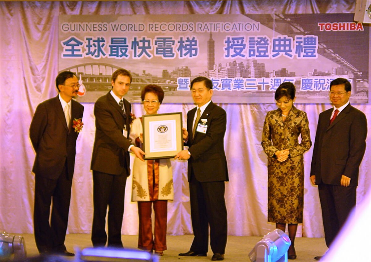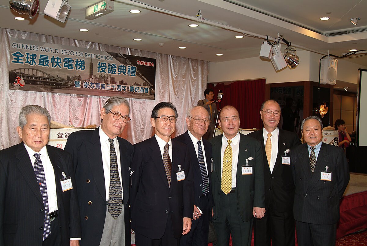 歷時5年,崇友協同東芝完成的台北101電梯群,其中包括兩台分速1,010m的特快梯,在大樓開幕前一日,由副總統呂秀蓮見證,獲頒金氏紀錄【世界最快電梯】的頭銜。是日,日本東芝社長西室泰三暨歷任事業部長們均與會分享榮光。