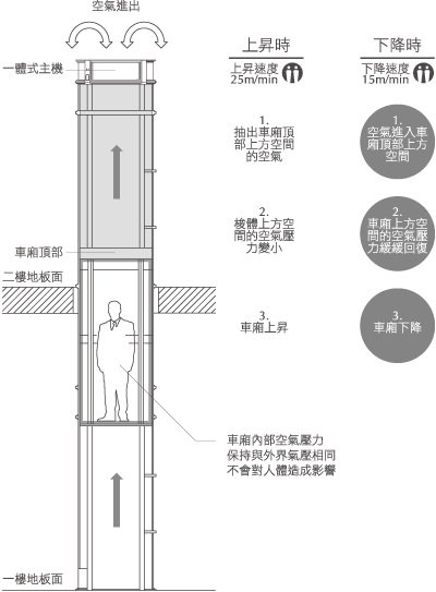NuVa真空氣動梭是採氣壓調節原理,可以精密控制上昇與下降的速度,主機利用抽氣減壓讓電梯上昇;下降時則進氣增壓完全無需電源。原理類似一般喝飲料時的吸管作用,吸取吸管中的空氣=NuVa上昇時的情況;嘴巴放開吸管=NuVa下降時的情況
