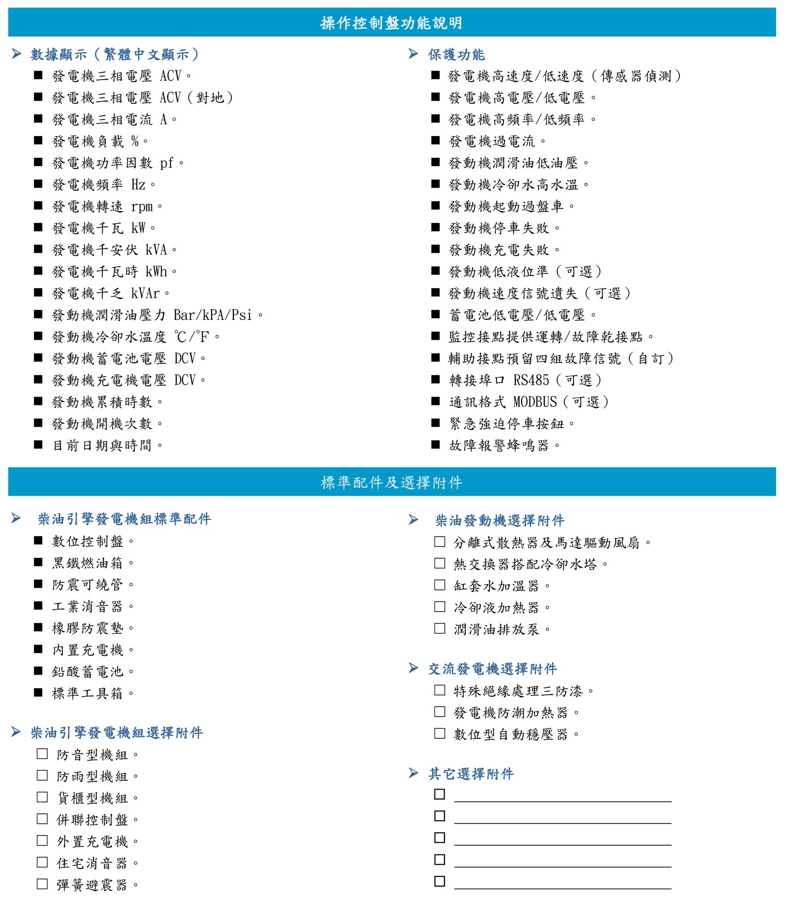 ◎ 完美的配套設備: 整套機組可安裝內置式或外置式減震墊、控制盤、啟動 系統、底盤油箱以及其他附件,可構成整體式電站。