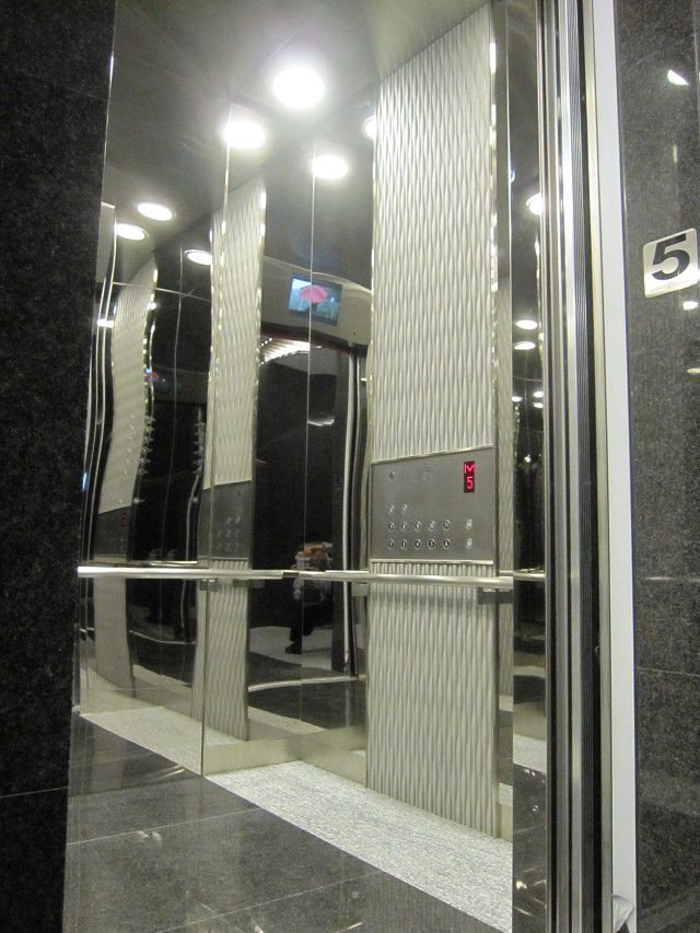 崇友實業為新光信義金融大樓暨寒舍艾美酒店提供22台電梯,4台電扶梯,總數共26台;圖為電梯車廂。
