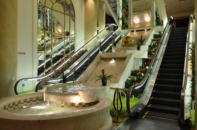 崇友實業為君悅大飯店提供19台電梯,8台扶梯;圖為大廳扶梯。