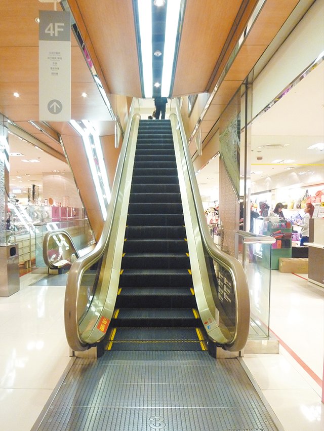 崇友實業為新光人壽摩天大樓提供25台電梯,32台電扶梯,總數共57台;圖為商場內部電扶梯。
